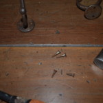 細君が納屋の奥から錆だらけのフックを見つけてくれた。同じものが何とかそろった。錆をワイヤブラシでゴシゴシ磨き、ボードにねじ止めする。同じ修理をするならネジもプラスネジで無く錆びたマイナスネジに、修理が完了し見てみると時代を感じさせるいい雰囲気が出ていました。