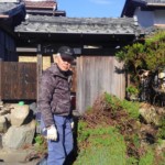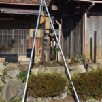 我家のように石垣の上に植えた場合の抜根作業は、石垣に入り込んだ根は、引き上げる前や引き上げ途中で、根切り棒や鋸などで切ってやる必要がある。これら必須の道具の中でチェーンソーは在所の運営会でお借りし、またチェーンブロックは米原市の景樹園さんからお借りしました。